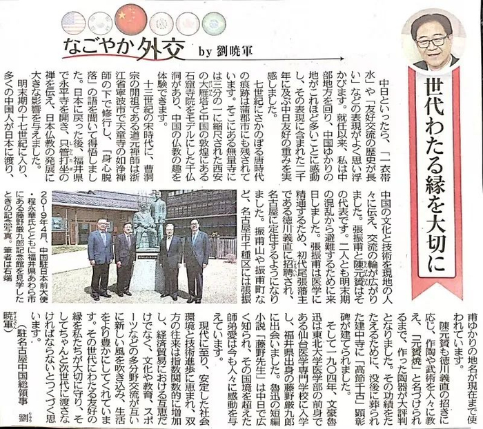 近日,驻名古屋总领事刘晓军在《中日新闻》发表题为《继往开来 传承友好》的署名文章,主要内容如下: