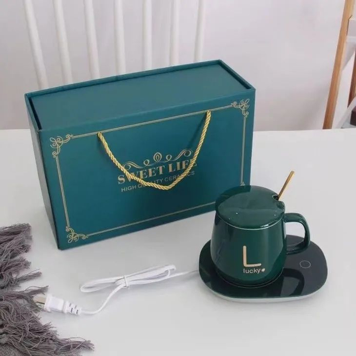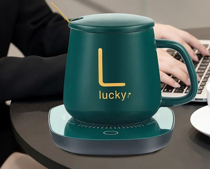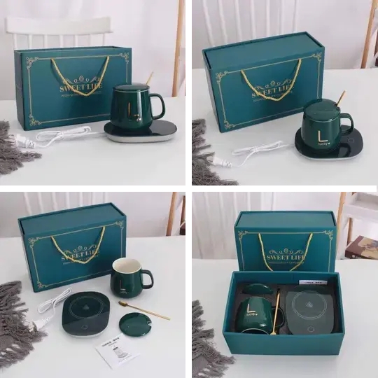 这杯子套装由陶瓷马克杯、恒温垫、杯勺组成,这个杯子的特点就是能一直保持恒温55°C。