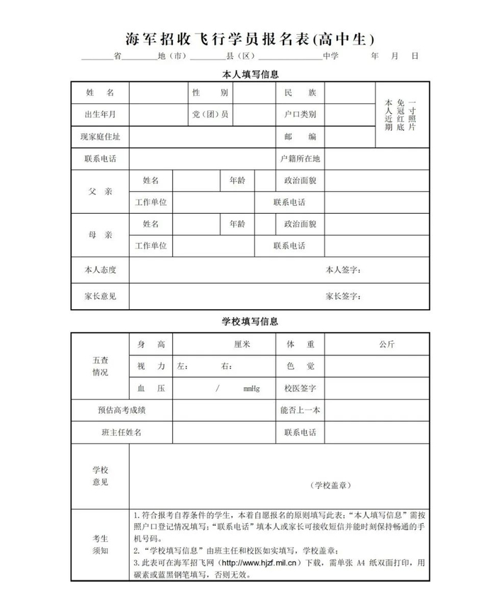 符合海军招飞报名自荐条件,且学籍、户籍(依据居民身份证号)均在陕西省的考生,需登录“中国海军招飞网”,凭本人身份证号注册个人账号,进入“网上报名”板块填写报名信息,生成《海军招收飞行学员报名表(高中生)》和《海军招收飞行学员初检预选体格检查表》,下载并正反面同页打印。