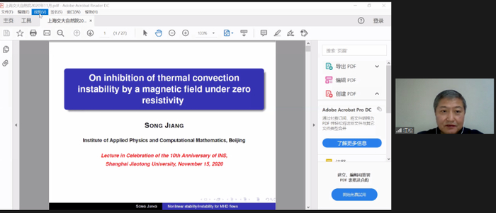 11月15日,自然科学研究院建院十周年纪念-自然科学杰出演讲系列讲座特邀北京应用物理与计算数学研究所江松院士作关于“零电阻率下磁场对热对流不稳定性的抑制作用”的报告。