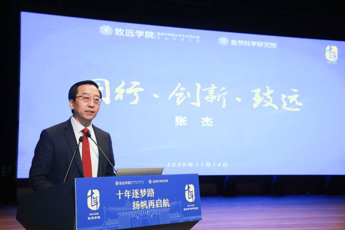 张杰作了题为《同行 创新 致远》的院士报告。他以“独行速,同行远”开启了对致远学院和自然科学研究院共同成长的峥嵘岁月的回顾,强调了研究型大学的本质,即将一群极具创新思维的教师与一群极具创新潜质的学生汇聚在一起,让他们的思维在对自然科学与社会科学基本问题和规律的探究中发生碰撞,并在碰撞中产生智慧与创新能力。他深情回顾了致远学院和自然科学研究院在创建过程所经历过的重重困难和考验,衷心感谢那些为致远学院和自然科学研究院的发展贡献过力量的“逐梦同行人”。他强调,大学教育应该更多地注重学生好奇心的激发和个性化培养,教育的根本生命力就在于创新,要学会建立正确的思维体系方法,运用正确的思维体系,对重要的自然问题和社会问题进行大量的思维探究训练,从容面对未来物质科学体系、信息科学体系、生命科学体系、人文科学体系四大知识体系。他指出“未来已来,唯变不变”,希望致远学院和自然科学研究院的师生校友不断创新以应对世界变化,不断前行以追求新的辉煌。