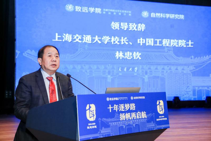 林忠钦首先致辞,他代表学校向致远学院和自然科学研究院的全体师生及海内外校友表示热烈祝贺,向长期以来支持学校和致远学院、自然科学研究院发展的各界朋友表示衷心感谢。他指出,致远学院和自然科学研究院十年间在拔尖人才培养、交叉学科研究等方面取得了令人瞩目的成果。就在上个月,致远书院正式奠基,由自然科学研究院牵头建设的上海国家应用数学中心(上海交通大学分中心)也正式揭牌。在肯定成绩的同时,他也向致远学院和自然科学研究院提出三点期望。第一,深化致远学院和自然科学研究院融合,构建交叉创新的学术氛围,为创新的孕育和未来优秀人才的成长提供优质的土壤和环境。第二,强化使命感召,让更多优秀学子回归祖国大地。学校近期正在大力推动本硕博贯通改革,鼓励学有余力的优秀学生在本科期间提前选读研究生课程,同时着力推进拔尖高校间的课程学分互认,为广大学子提供更大范围的一流优质课程资源。第三,关注世界局势,以发展应对变局。希望致远学院和自然科学研究院以前瞻的视角、发展的眼光关注世界,主动赋能,拥抱变化,在新时代坐标中,肩负起培养基础学科交叉研究领域未来领军人才的使命责任,为实现中华民族伟大复兴不懈努力。