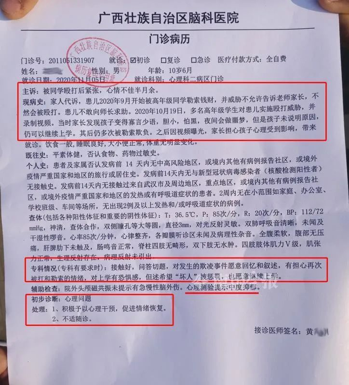 记者在小天的病历上看到,小天的心理测验提示中度抑郁,初步诊断有心理问题。建议积极予以心理干预,促进情绪恢复。