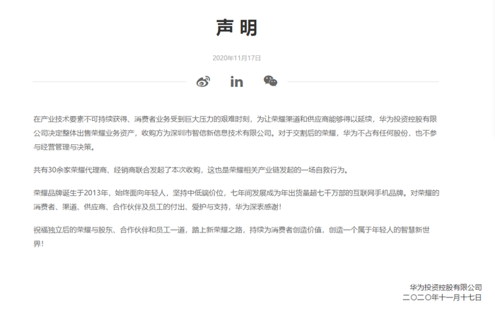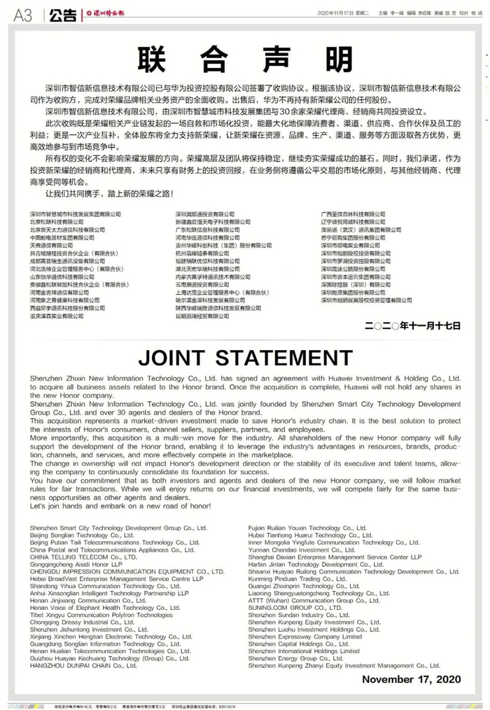17日,多家企业在《深圳特区报》发布联合声明,深圳市智信新信息技术有限公司已与华为投资控股有限公司签署了收购协议,完成对荣耀品牌相关业务资产的全面收购。出售后,华为不再持有新荣耀公司的任何股份。