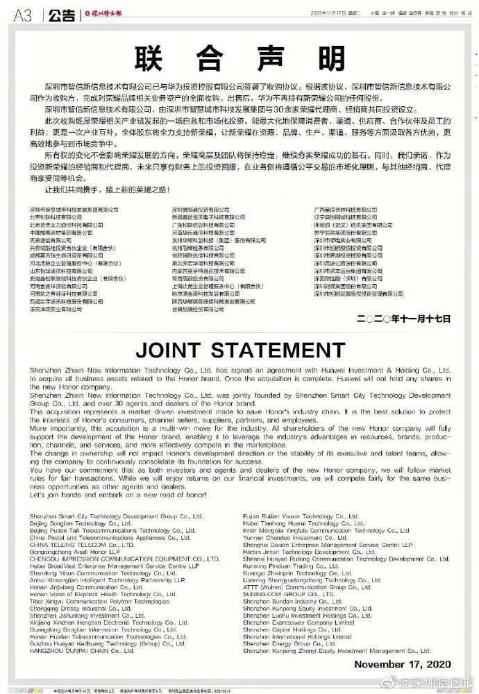 今日,多家企业在《深圳特区报》发布联合声明,深圳市智信新信息技术有限公司(下称“深圳智信新”)已与华为投资控股有限公司签署了收购协议,完成对荣耀品牌相关业务资产的全面收购。出售后,华为不再持有新荣耀公司的任何股份。
