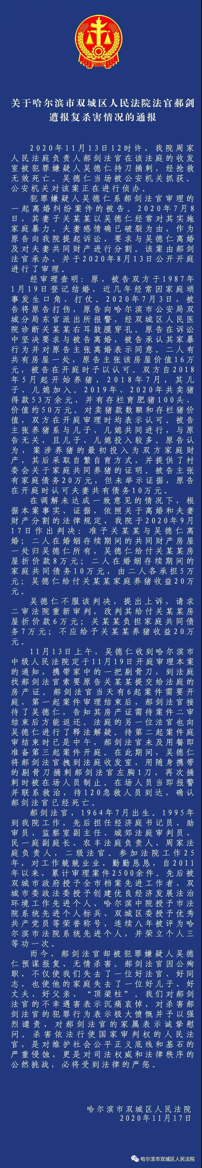 11月17日下午,黑龙江省哈尔滨市中级人民法院公布“不服离婚判决捅杀法官”案件详情: