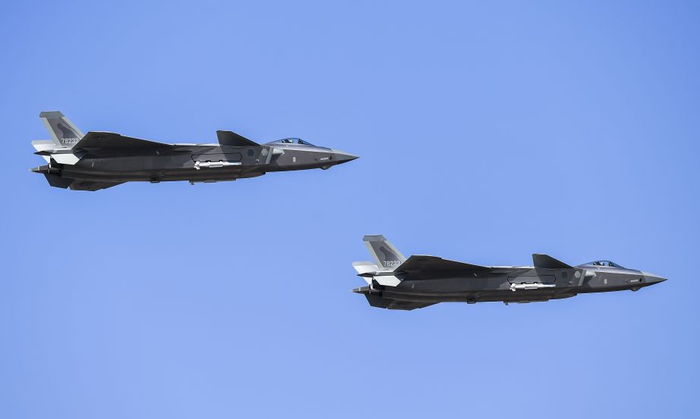 另一角度拍摄的空军歼-20双机编队。(图片来源:中国军网)