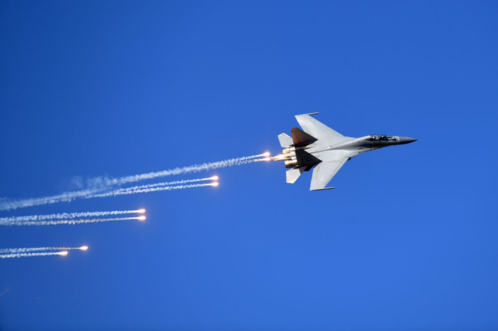 歼-16战斗轰炸机在低空飞行表演时释放热焰弹。(图片来源:中国军网)