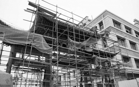 11月16日,太原钟楼街片区经过半年多的改造后,始建于清末民初的百年邮局、说书馆、兴业钱局保护性修复主体工程已基本完工。而作为钟楼街的新地标——按察司牌楼,按1:1复建主体建筑已经完成80%左右,现正进行后期装饰工作。