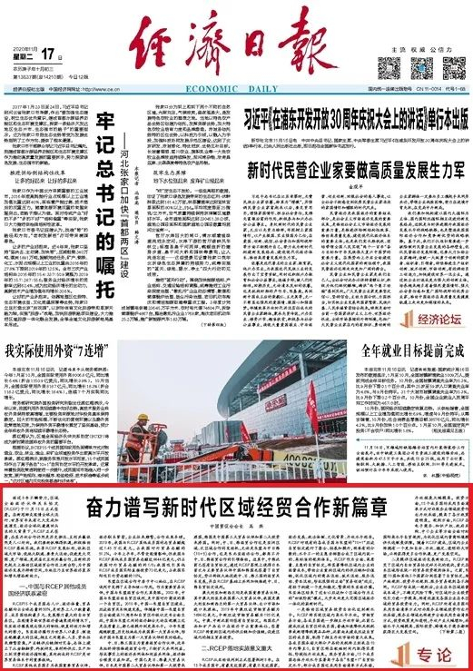 11月15日,历经8年谈判的区域全面经济伙伴关系协定(RCEP)终于“尘埃落定”。经济日报头版今天刊发中国贸促会会长高燕的文章《奋力谱写新时代区域经贸合作新篇章》,详解RCEP↓↓