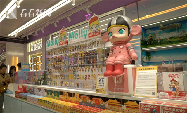 和展会上发售的新品限定款不同,在零售商店里,潮玩大多则以盲盒的形式发售。盲盒概念起源于日本的福袋和扭蛋机。之所以叫盲盒,是因为盒子上没有标注,只有打开才会知道自己抽到了什么。在泡泡玛特零售商店,许多顾客拿着盲盒不停晃动,希望抽到概率为1/144的隐藏款。店员表示,有的顾客甚至会耗资8000元整箱购买。