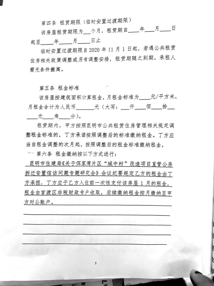 陆女士介绍,当时,官渡区住房和保障局作为甲方,佴家湾回迁户作为乙方,官渡区住建局作为丙方,昆明兆丰房地产开发有限公司作为丁方,四方签了一份“昆明市官渡区直管公房临时过渡安置租赁合同”。该合同第六条注明:“乙方的租金由丁方承担,丁方应于乙方入住前一次性支付该房屋1个月租金,租金由官渡区非税财政专户收取,后续缴纳租金按月缴纳至甲方对公账户。”