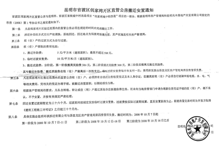 陆女士出示了一份通知,是2008年9月27日,由昆明兆丰房地产开发有限公司发布的“昆明市官渡区佴家湾片区直管公房搬迁安置通知”。通知第七条写明:“回迁安置过渡期暂定为三十六个月,过渡期间按规定发放临时过渡安置费,过渡费按实际过渡期结算,直至安置新房为止。新建房屋交房时间为开发方取得建筑工程施工许可证之日起三十个月内。”