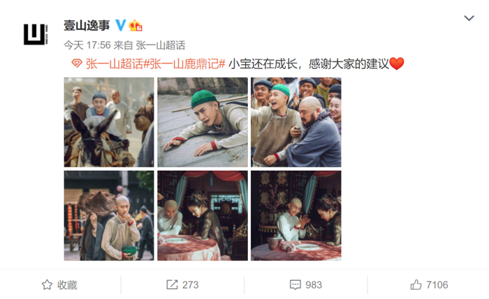 近日,张一山也在接受媒体采访时回应,这版《鹿鼎记》画风已经往卡通和搞笑上走了,可能表演方式会有些变化,有时会写意一点,不会那么落地,这都是创作手法,人和事肯定是尊重原著的。希望能给观众带来一些新鲜的东西,让观众爱看。同时他也表示:“千万不要把我当特好的演员,因为我也有演不好的时候。”