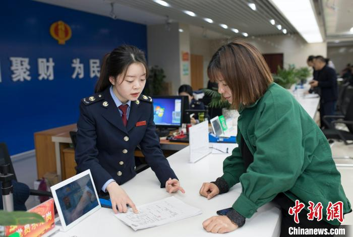 图为办税服务厅窗口人员向办税人讲解税费优惠政策。焦相寅供图