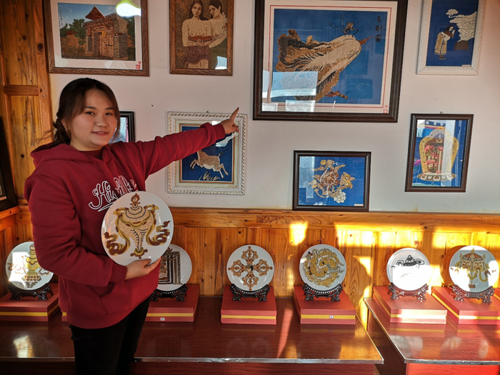 11月12日,记者走进德吉村青海省巾帼专业合作社、扶贫车间、残疾人扶贫就业基地。讲解员德吉桑毛正在向游客介绍五谷画的历史及制作工艺:“五谷画起源于藏族用五谷绘制吉祥图案祈福的民俗。随着人们思想和审美观念的演变,这种习俗逐渐变成手工艺品,五谷画制作工艺复杂,经过选粒、浸药、蒸熏、烘干、磨板、粘贴、增亮、装裱等工艺,制作出的成品具有防虫、防腐、不变形、不褪色、不胀缩、立体感强、保存久远等特点,在藏文化中被视为‘天精地华’的艺术珍品。”