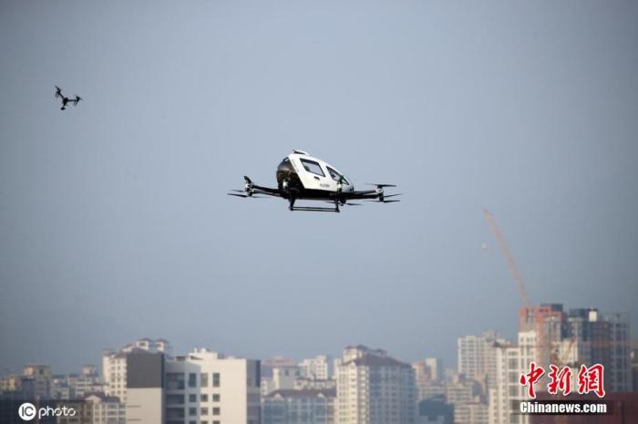 当地时间11月16日,韩国大邱,一架“空中出租车”进行试飞活动,展示并检测空中飞行技术应用等。图片来源:ICphoto
