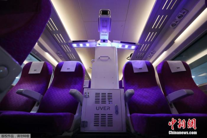 当地时间9月29日,韩国首尔Suseo车站,机器人在车厢内进行消毒工作,预防新冠病毒传播。
