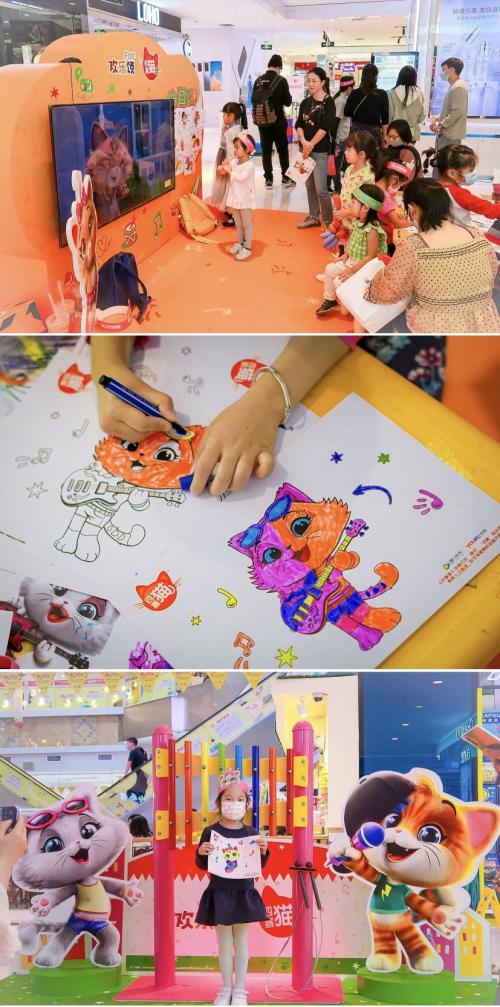 除了热情摇滚舞台表演,还有创意无限的绘画课堂、趣味无穷的互动装置、更有精彩的正片内容观看体验。小朋友们看着四喜猫原声动画的同时,能尽情发挥自己的小宇宙,描绘出一个个只属于自己的四喜猫。