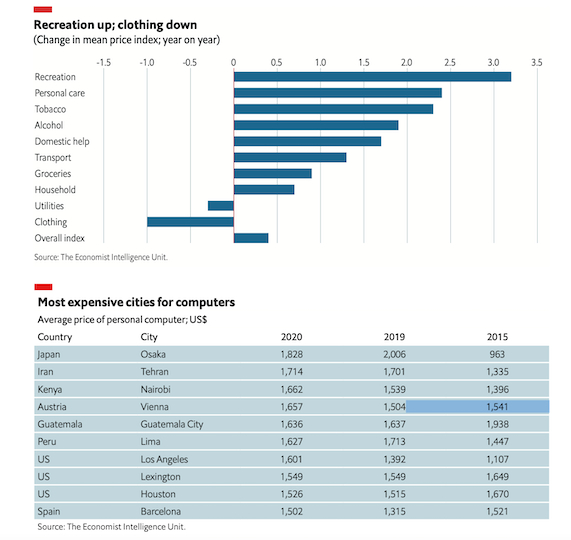 香烟的价格在所有非耐用品中出现了最高同比增幅。除烟草外,物价指数平均涨幅最大的是娱乐消遣类商品,包括晚餐套餐、平装书、电视和个人电脑等各种消费品。娱乐类商品中价格指数上涨最多的是电子消费产品。个人电脑的消费平均上涨了18.7个点,其中大阪的费用最贵,加拉加斯的费用最便宜。当远程工作推动了对笔记本电脑和计算机的需求时,停产导致了产品短缺和高价。