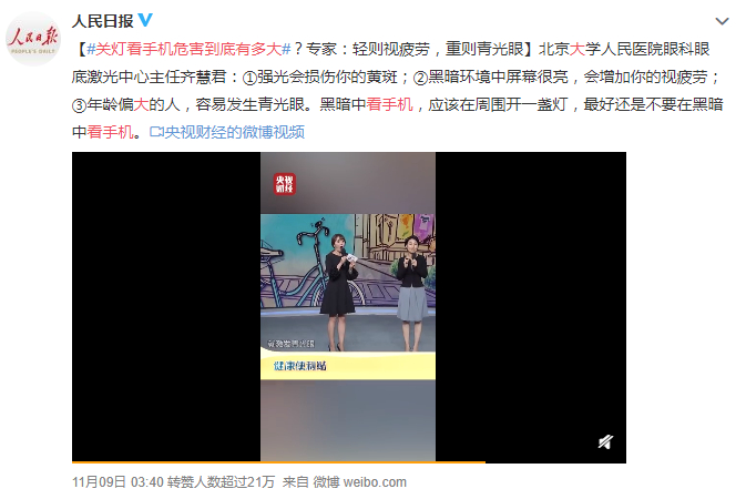 有专家表示:关灯看手机,轻则视疲劳,重则青光眼。