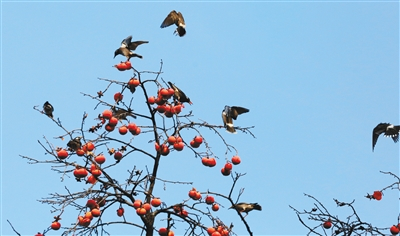原标题:火红柿子挂满枝头 成群鸟儿尽享美味