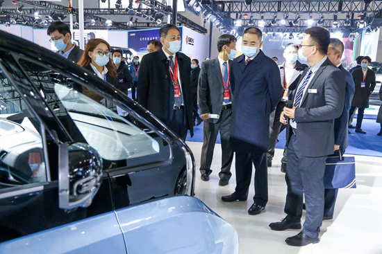 在2020世界智能网联汽车大会现场,工业和信息化部副部长辛国斌(前排右二)参观新宝骏展台。