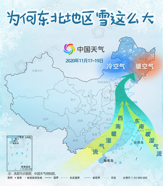 西南暖湿气流和东南暖湿气流北上汇合后,在东北地区一带遭遇冷空气,冷暖气团激烈“碰撞”产生大范围雨雪,由于暖湿气流实力强劲,水汽补给非常充分,导致降雪持续,局地雪量大。