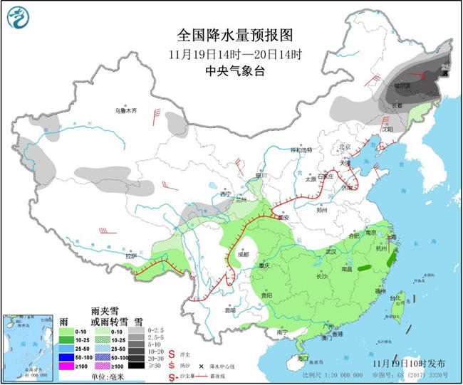 图为19日凌晨哈尔滨出现降雪,风雪交加,路人艰难出行。(图/吕国君)这次内蒙古及东北等地降雪量大,中央气象台11月17日为此拉响今冬首个暴雪蓝色预警,18日黑龙江东南部、吉林西北部、内蒙古中部和东南部等地出现大到暴雪,黑龙江牡丹江、内蒙古通辽和赤峰局地大暴雪。今天(19日)中央气象台继续发布暴雪橙色预警,东北地区强降雪持续。