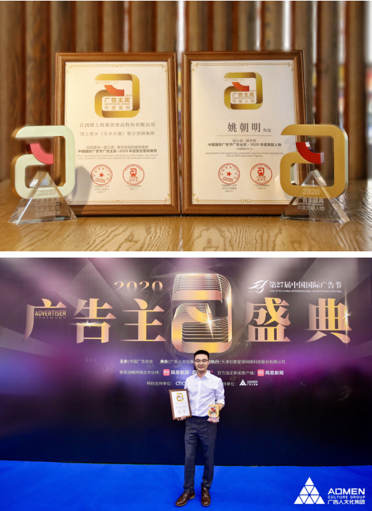 本届广告主奖吸引百余家媒体推荐和上千个企业参选,评审团由中国传媒业、广告界各路精英组成,经过激烈角逐,最终《煌上煌X见多识廣整合营销案例》 凭借营销策略的创新性、用户体验与互动、媒介公关整合传播以及营销效果等方面的突出表现,最终斩获“2020年度整合营销案例”奖。 煌上煌品牌总监姚朝明先生同时被组委会认定并颁发“中国国际广告节广告主奖 · 2020年度贡献人物”奖。