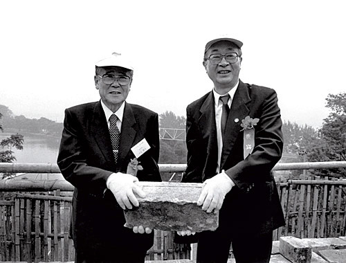 (平山郁夫先生(左)在南京城墙修复工地参加义务劳动)