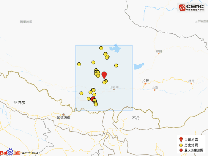 历史地震:根据中国地震台网速报目录,震中周边200公里内近5年来发生3级以上地震共53次,最大地震是2020年3月20日在西藏日喀则市定日县发生的5.9级地震(距离本次震中171公里),按震级大小前50次历史地震分布如图。
