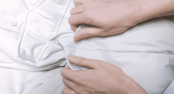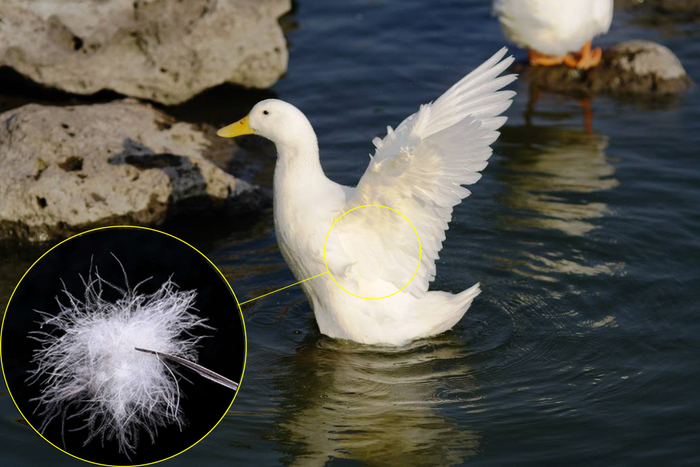 精心挑选贴近白鸭皮肉的羽绒,这里的羽绒是坚守体温的重要防线,也是非常保暖、锁温的部分。