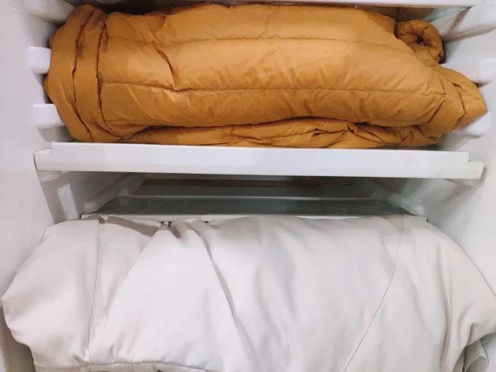 然后,同时用羽绒服包裹后,放到-18℃的冷冻层中。