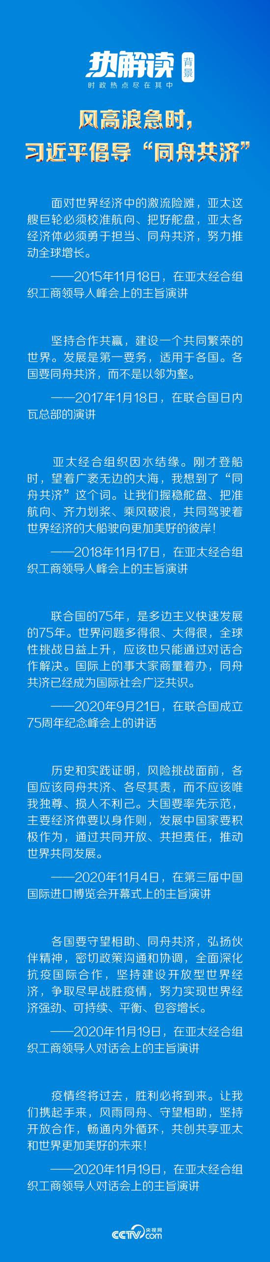 习近平主席在亚太经合组织工商领导人对话会上以“同舟共济”作喻:“各国要守望相助、同舟共济,弘扬伙伴精神,密切政策沟通和协调,全面深化抗疫国际合作,坚持建设开放型世界经济,争取尽早战胜疫情,努力实现世界经济强劲、可持续、平衡、包容增长。”