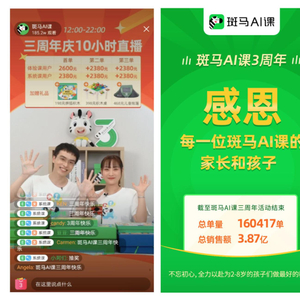 11月20日,少儿AI课教育领导者斑马AI课举办三周年直播活动,回馈家长和孩子三年的信赖与支持,活动吸引超过185万家长参与,共计16万次下单,售课额达3.8亿元,这是目前教育类品牌在自有直播渠道单日活动中创下的首个行业案例。