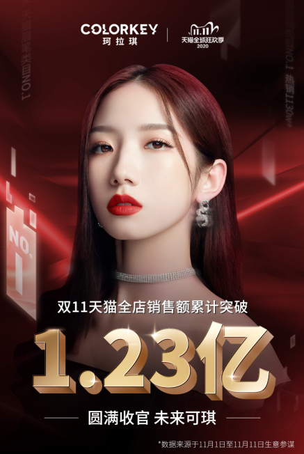 国货美妆品类持续爆发,在天猫公布的16个破亿新品牌中,美妆就占了6席,占比三分之一,已经成为新品牌孵化的主战场。其中,"美尚股份"旗下潮酷彩妆品牌colorkey珂拉琪(以下简称"珂拉琪")打破2019年天猫"双11"的首战业绩2780万元,今年,以双11全渠道销售额突破1.6亿元,11月11日80分钟天猫旗舰店累积销售破亿,再度实现迅猛增长,成为入驻天猫不到三年双十一破亿仅有的三家彩妆电商公司之一。"C位唇釉家族"前1小时爆卖100万支,80分钟销售额破亿,拿下唇釉品类TOP 1的成绩,刷新国人对国货彩妆品牌的认知。而早在第一波抢先购阶段,珂拉琪就创下了全渠道销售额7000万+的战绩。