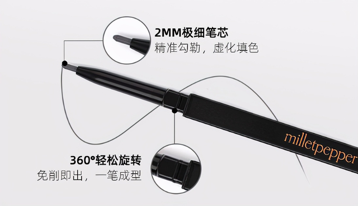 Milletpepper眉笔笔芯软硬适中,极细的2mm笔芯,能够画出根根分明的眉毛,超级自然。蜡质笔芯,防汗防晕染,有效持妆超过12小时。是新手化妆包不可缺少的单品。