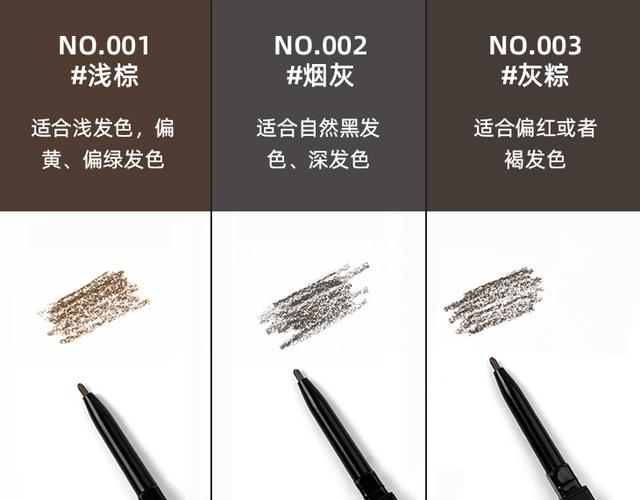 Milletpepper眉笔有3种颜色可选,浪漫浅棕,时尚烟灰,低调灰粽,可以根据自己习惯的妆容风格和发色,自由选择搭配合适的眉色。