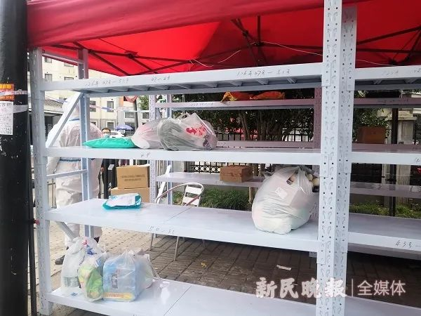 新民晚报记者注意到,封闭后,小区门口临时搭起了两个快递和外卖取货架,实施无接触式配送、取货。上面标注了具体的楼号,快递员只需将配送物品放在取货架上即可,之后再由物业工作人员将物品交到居民手上。在现场的一位张江镇政府工作人员告诉记者,送来的快递将一律作消杀处理,之后再送进小区。
