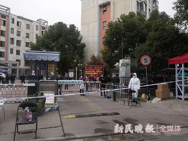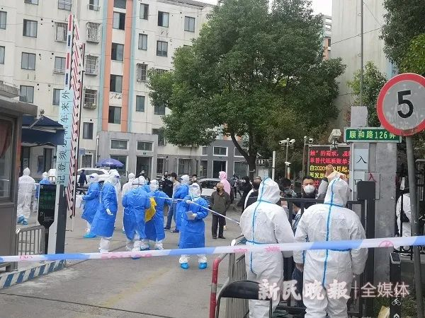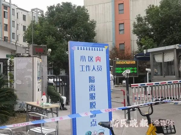 在现场,新民晚报记者看到,小区门口已围起一圈警戒线,多位民警和保安人员在门外驻守执勤,同时小区门口设有专门的“小区内工作人员隔离服脱卸点”,并配备消毒液等消杀物品。上午9时15分,多位医护人员在小区门口穿戴好防护装备,准备进小区做检测工作。
