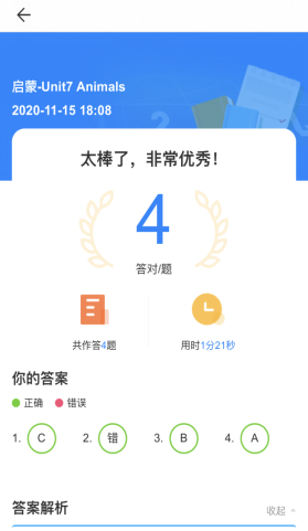 Magic Growth线上练习册根据不同级别的课程分别设置了每课4道或者6道练习题,覆盖本节课重点知识点,小伙伴们仅仅只用花几分钟的时间即可完成预复习,并且查看答案,知道自己错在哪里,薄弱点在哪里。