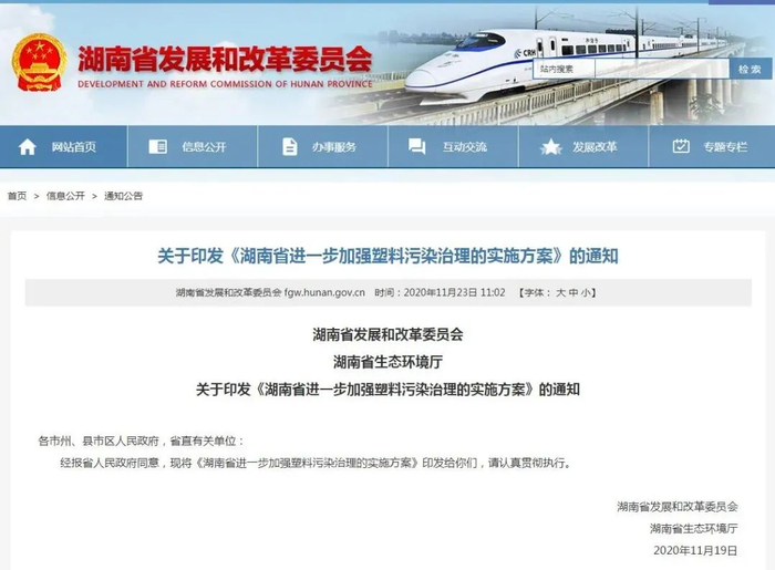 11月23日,记者从湖南省发改委了解到,为进一步加强塑料污染治理和长效管理机制建设,湖南印发《湖南省进一步加强塑料污染治理的实施方案》的通知(以下简称《通知》)。