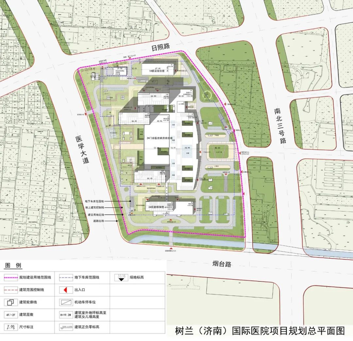 根据建设工程规划许可批后公示,此次树兰(济南)国际医院的多个规划细节也随之曝光。医院具体位于槐荫区医学大道以东、烟台路以北、日照路以南,用地面积约9.98万平方米,总建筑面积约34万平方米,其中地上建筑面积约19.6万平方米。停车数量为2807个,其中地上187个,地下2620个。从规划图看,整个项目地上建筑层数分别为22层、14层、8层等,将规划建设感染综合楼、门诊医技病房综合楼、后勤保障楼等。