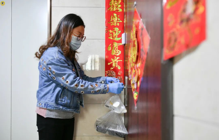 拿到餐食,沈燕把餐食挂在房门口,发了个微信给小林爸爸。记者了解到,小林暂时无法去学校上学,学校为她安排了网课,并由老师专门关心对接。小林是初三学生,根据她的情况和需求,平时居委干部不轻易打扰她,避免影响孩子上网课、复习功课。