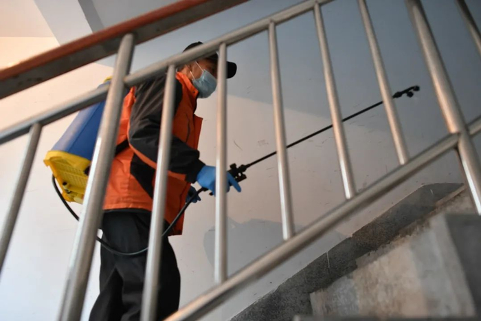 23日16时,物业工作人员崔师傅正对楼道进行消毒