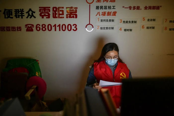 今日凌晨2时,许多人进入了梦乡,宝业居委会办公楼的灯却依然亮着。年轻的居委干部吴梦怡和丁思怡留下来值夜班,继续清点、整理业主信息的排摸情况。手机里消息不断,泡好的方便面被搁置在一旁,渐渐没了热气。她们起身扭了扭酸涩的身体,去茶水间泡好一壶热茶,便继续投入到工作中。窗外,雨淅淅沥沥地在下,保安队队长曹强娃刚从小区里巡逻完,又回到门卫室里换晚班。他头顶上有一盏暖黄色的灯,光线虽并不明亮,却在这个寒夜,让人感到非常温暖。