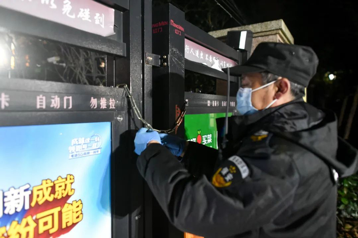 24日0时,宝业万华城保安正在按照疫情防控预案封锁小区东门