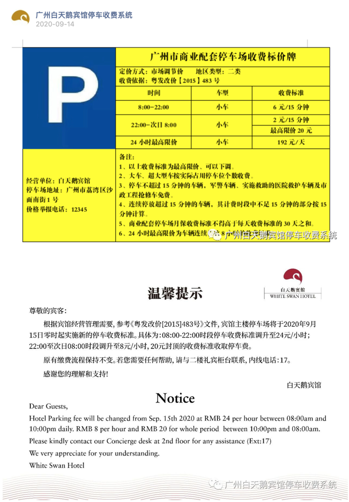 9月14日,该账号发布消息,白天鹅宾馆停车收费调整从9月15日零时为24元/小时,24小时最高限价192元/天。