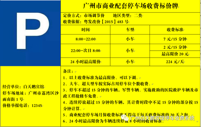 根据最新的收费标准,12月1日起白天鹅宾馆在08:00-22:00时段小车停车收费为7元/15分钟(即28元/小时),22:00-次日08:00小车停车收费为2元/15分钟(20元封顶),24小时最高限价224元/天。